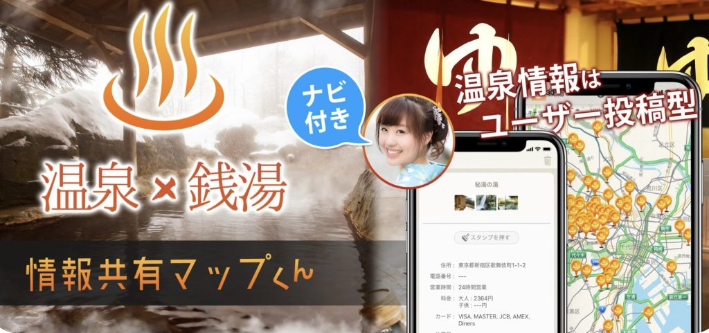 マップで温泉や銭湯を探してから、ホームページで営業時間や金額を確認するのは結構大変ですよね。入浴施設を探すなら、「銭湯/温泉/サウナ 口コミ情報共有マップくん」がおすすめ。