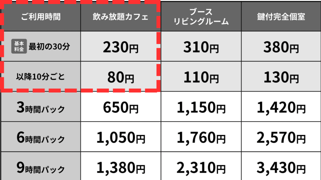 そのため30分間のオープン席を利用をすることで、シャワーを230円(税込)で利用することができます(2024年11月時点)。